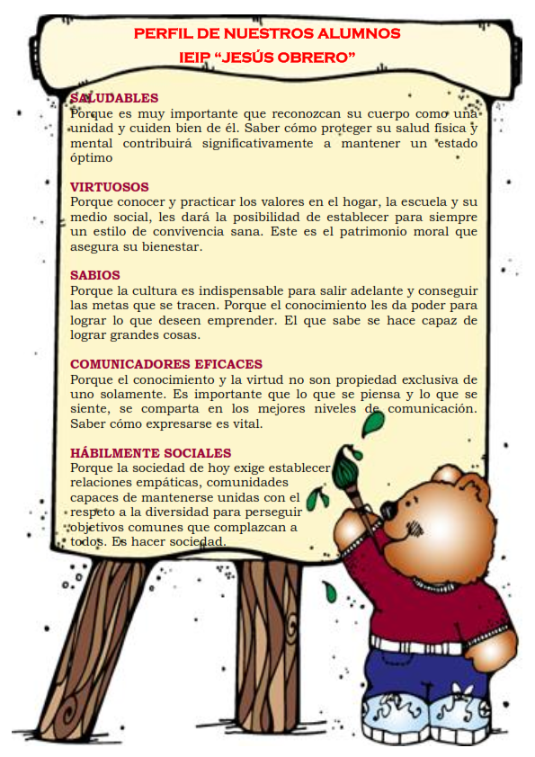 Somos una Institución que forma niños y niñas con un alto nivel académico y humano, desarrollando al máximo sus capacidades psicomotoras, comunicativas y artísticas. Juntos formamos una comunidad educativa como parte de una sociedad responsable, acorde a la espiritualidad de Jesús Obrero.